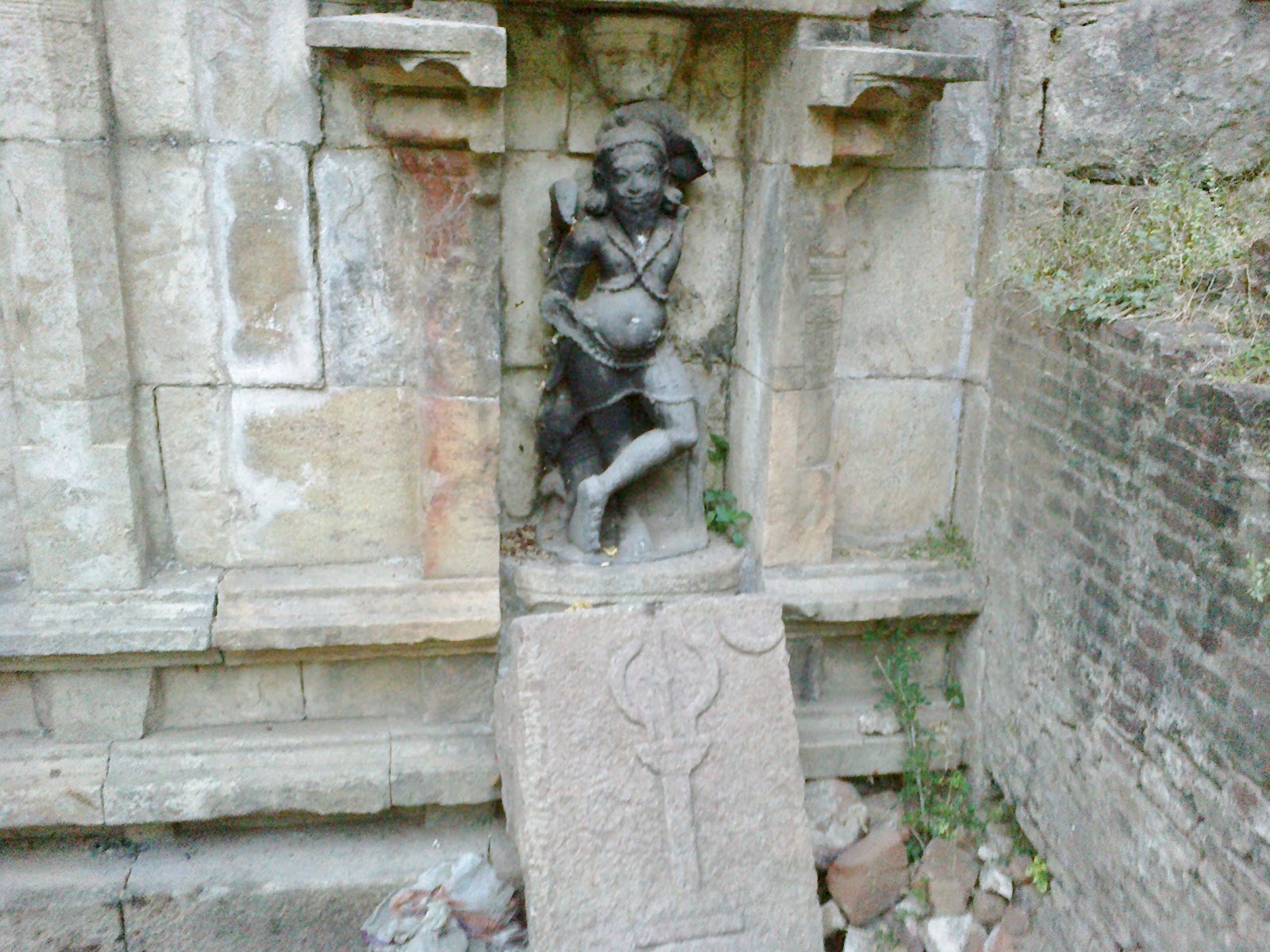 Adhikara Nandikeswara with folded hands is on the left. He carries stag and "Parasu" in his hands . He has a sword kept across his chest and wears a ring on the left ear to mark the ardhanari amsam. A nicely carved crown adorns his head. The hands of the Dwarapalas are also damaged.